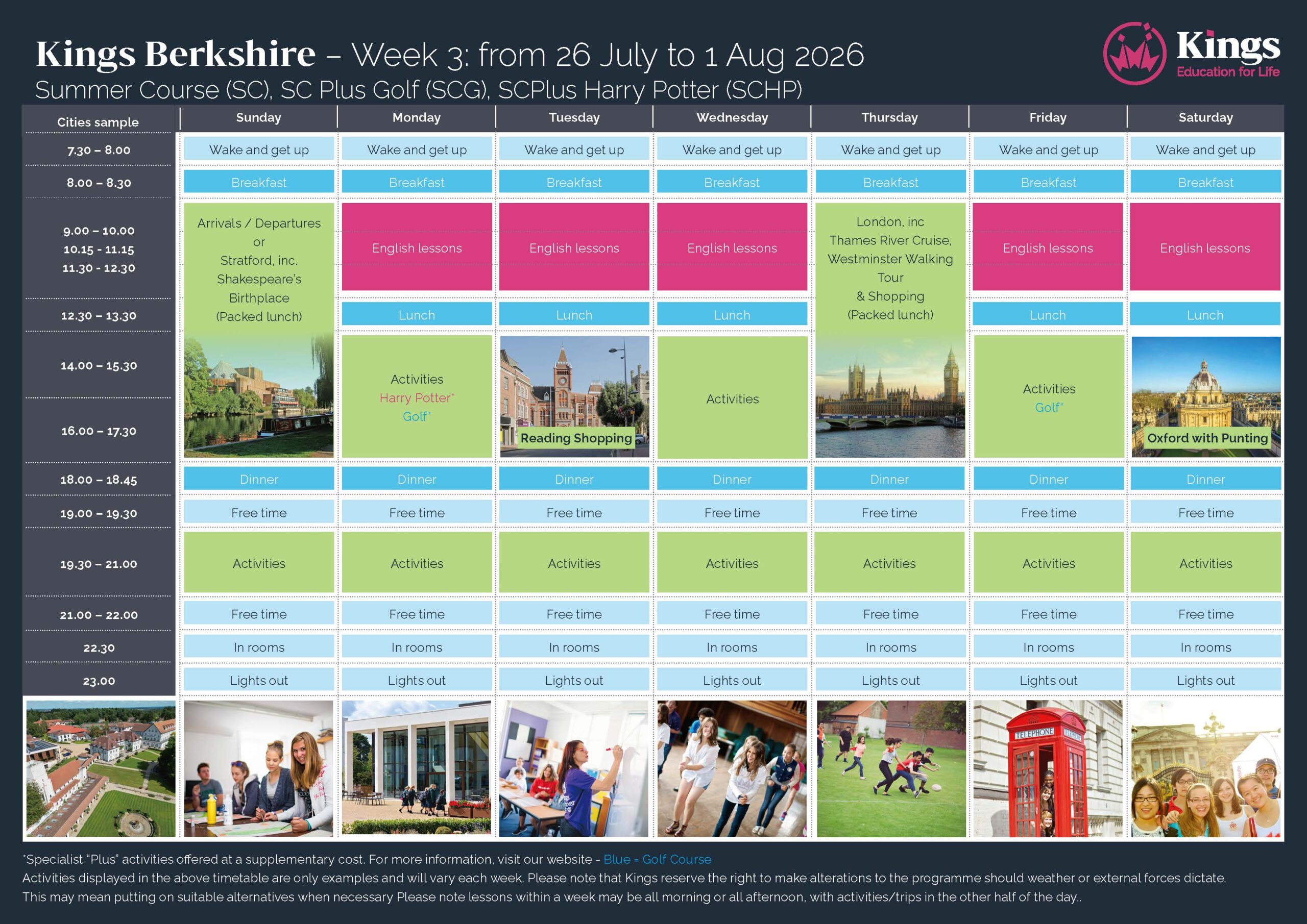 “Downe House School'”はロンドンの中心から車で1時間ほどの街、ニューベリー(バークシャー)近くのコールド アッシュにあるボーディングスクール(寮のある学校)です。普段は11歳から18歳までの女子学生が勉学ん励む全寮制の私立女子学校です。歴史ある教会や修道院を残しながら、美しくモダンな学生寮やテニスコートやスイミングピールなどのスポーツ設備などの充実した施設が整う学校です。そんなDowne House Schoolを利用し、夏休みの期間に世界各国から集まる留学生と一緒に英語の勉強、アクティビティ、さらにゴルフレッスンも追加されたプログラムです。寮生活を通じて異文化交流楽しみましょう。このプログラムは、キングスカレッジという語学学校が“Kings Young Learners”と呼ばれる中高生向けの「インターナショナルプログラム」を、学校施設を借りて運営しています。日本ではなかなか味わうことのできない「寮生活」をぜひ体験してみてください。